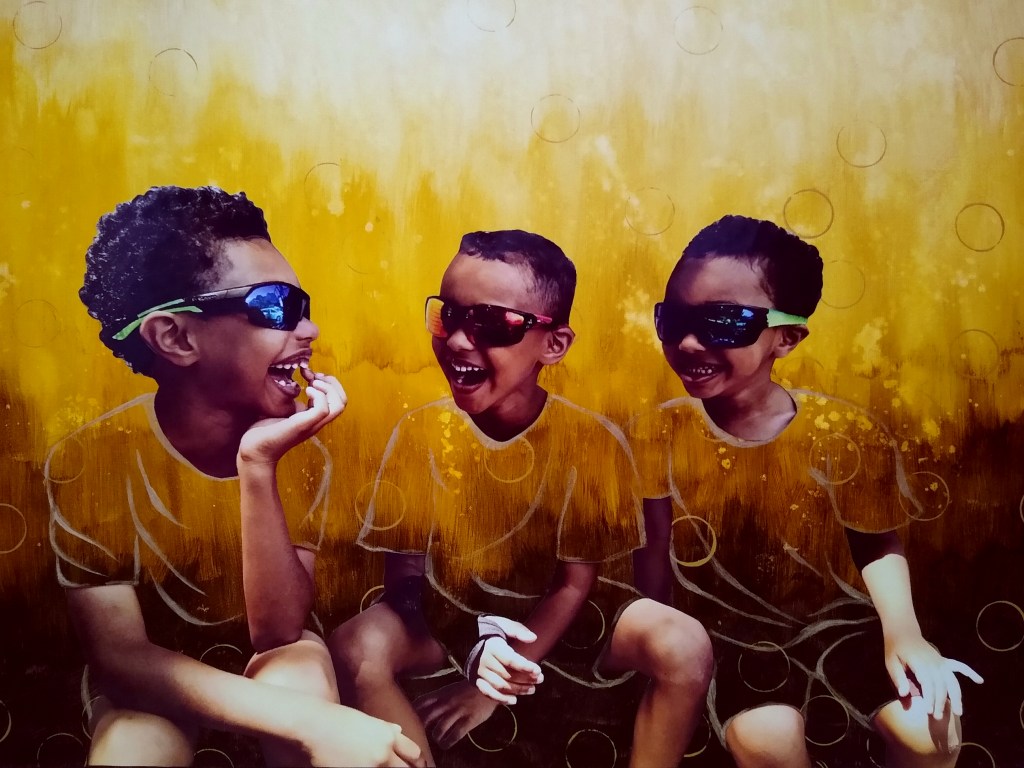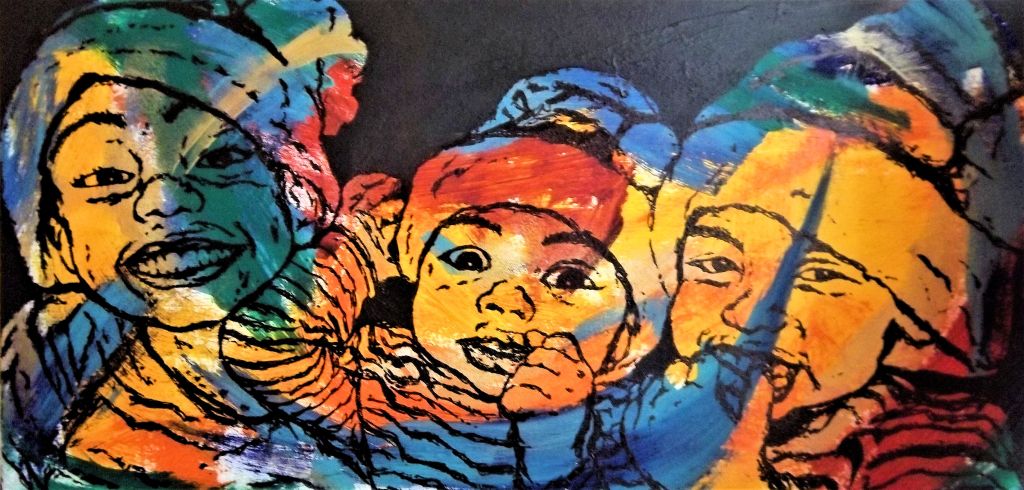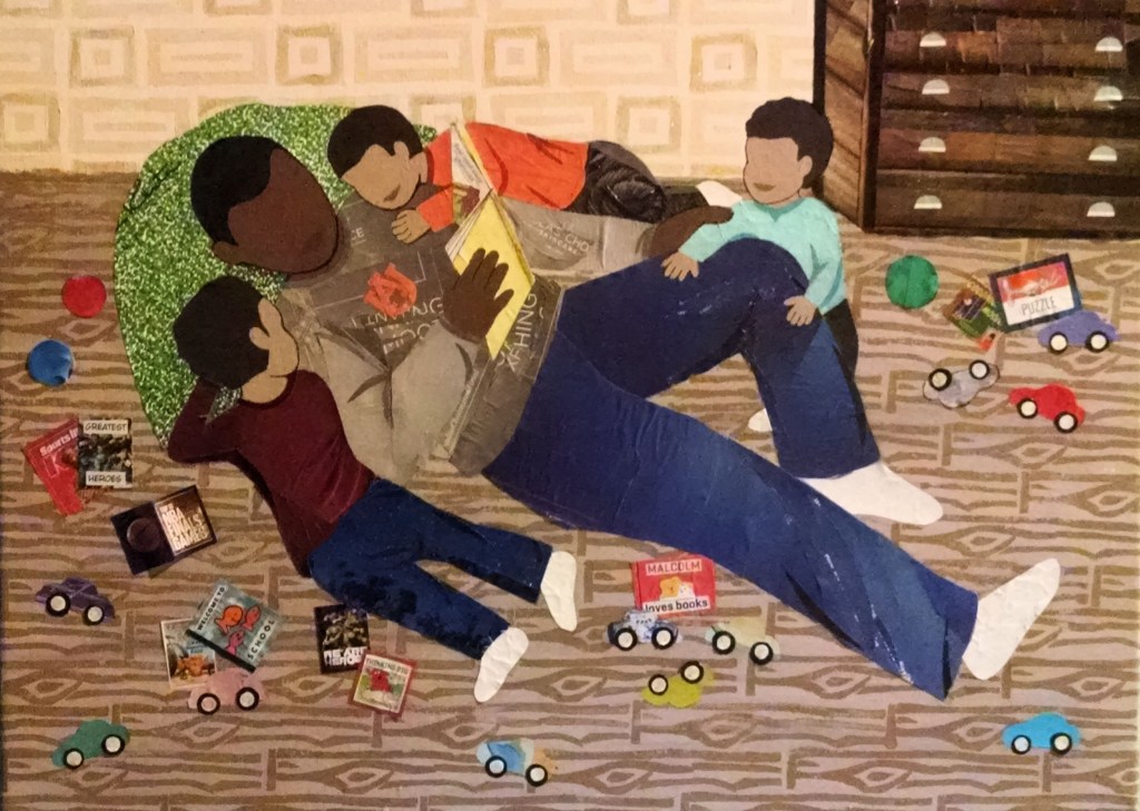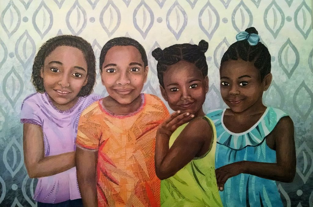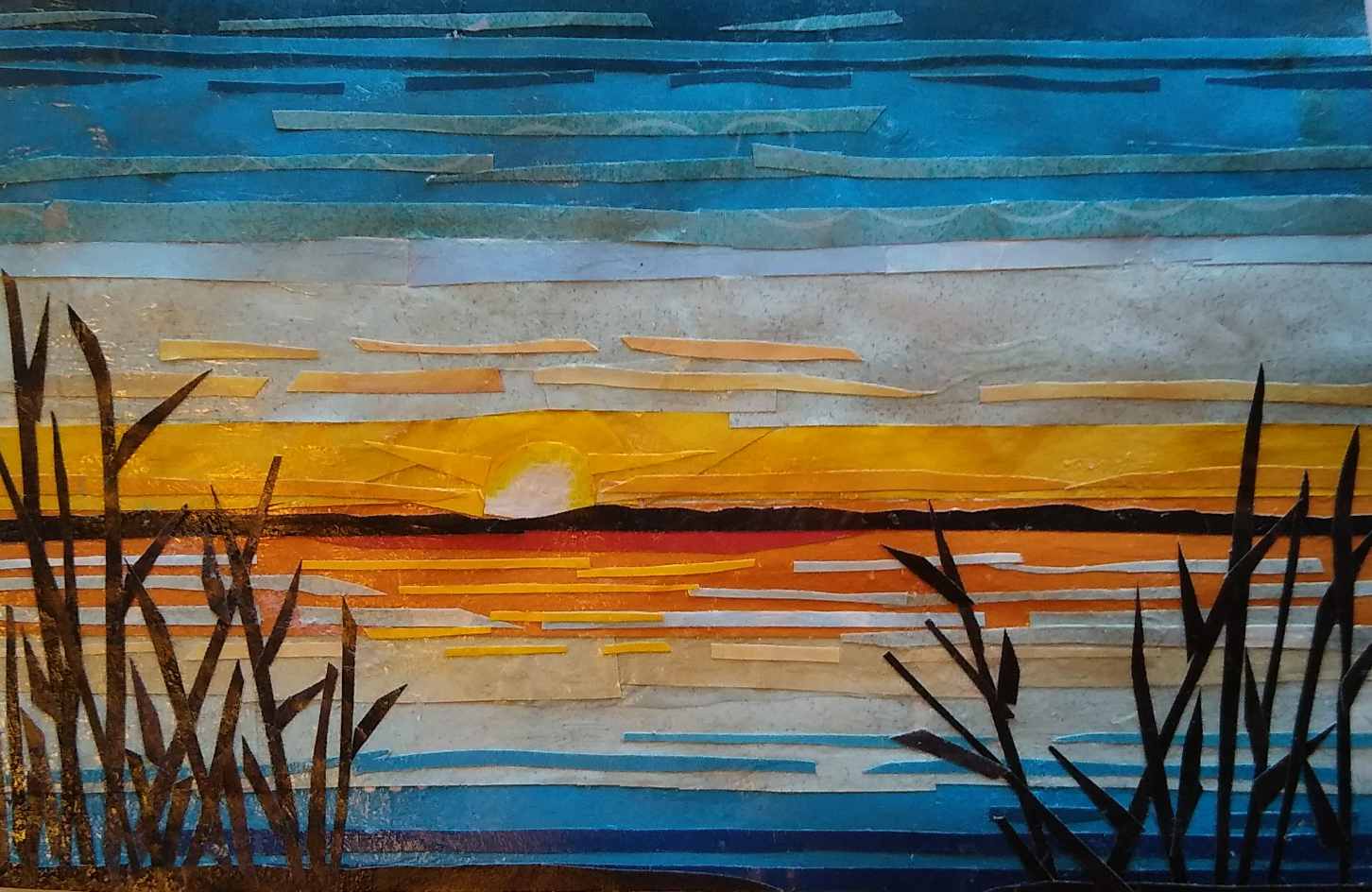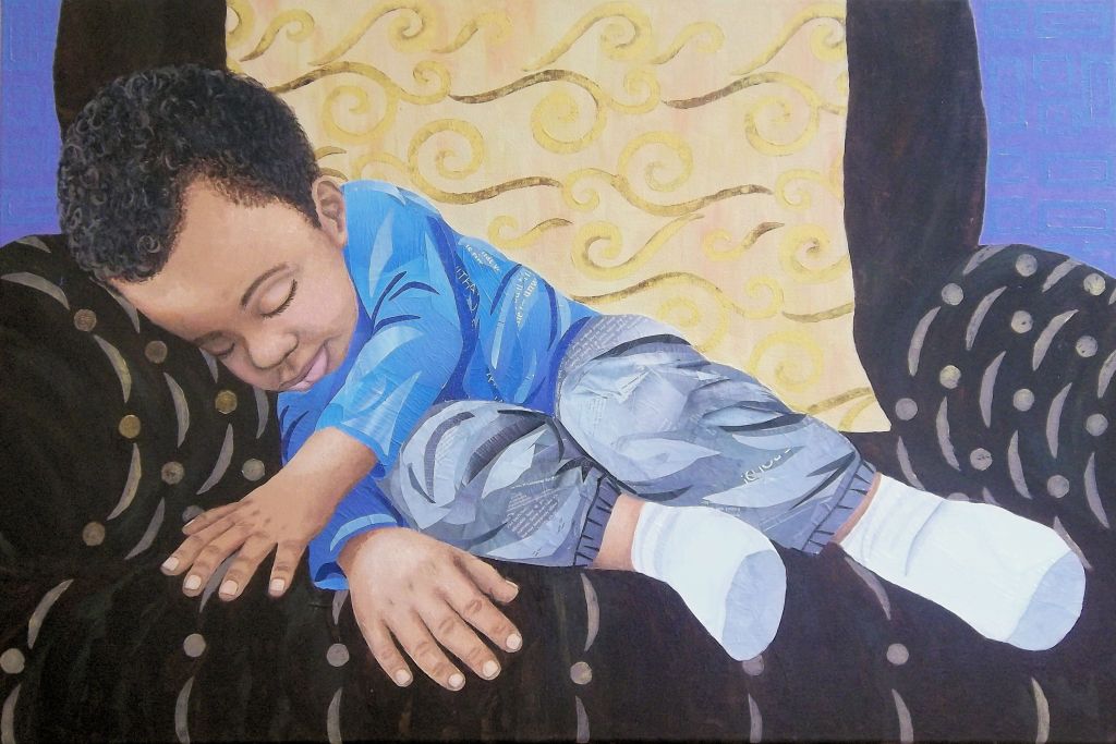 A variety of Papers, Paint, Block Printing, Ink, Photos and Fabric used in various combinations and paired with particular colors support the message and mood within each piece.
